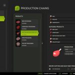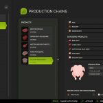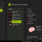 The butcher produces meat pallets from cows (buffalo not recommended), pigs, horse, chickens, and sheep/goats. Animal quantities are calculated at approximately 1 ton per pallet, with slaughter age based on gestation periods.
