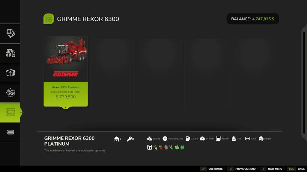 Grimme Rexor 6300 v2.0.0.0 November 16, 2025 in Combines Category: Beet Harvesters Price: $739500 Power: 653 hp Max. speed: 40 kph Capacity: 450000 Optimized the file Harvest all rootcrops now and vegetables Increased capacity Changelog 2.0.0.0 Updated the moddesc Rate this post