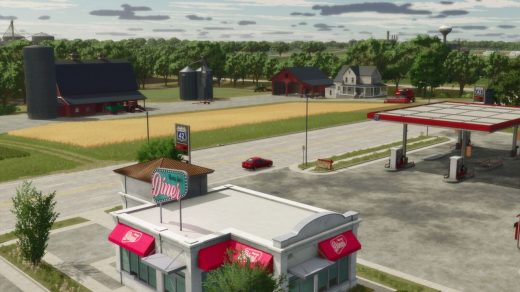 The Map hosts a 1000 head cattle farm, large sheep/goat barn, and a chicken farm capable of holding 5000 chickens! Also is several large area for logging, all logs are able to be cut and run by buncher and processors, one area in particular is 1000 acres and has many terrain changes to test your logging skills on. Once you reach the top, you will find the logging base. Or you can take the ferry across the river and farm or log the other side. There is a grain elevator, sawmill, carpenter, spinnery, tailor, restaurant, BGA, Canned good factory, and Warehouse.