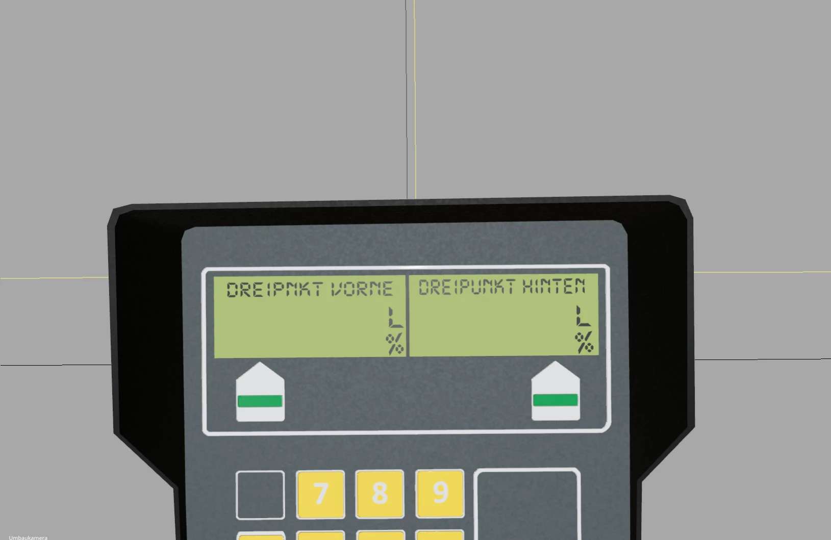 Implement on 3-point linkage front: Fill volume in liters and percentage