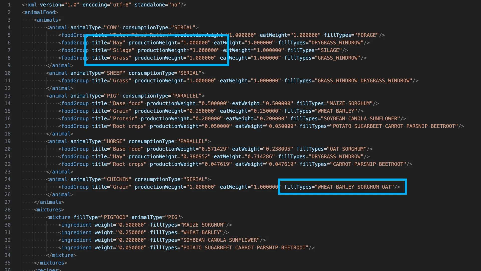Schema-Validated Configuration: Uses the game’s built-in AnimalFoodSystem schema for robust, error-checked XML handling