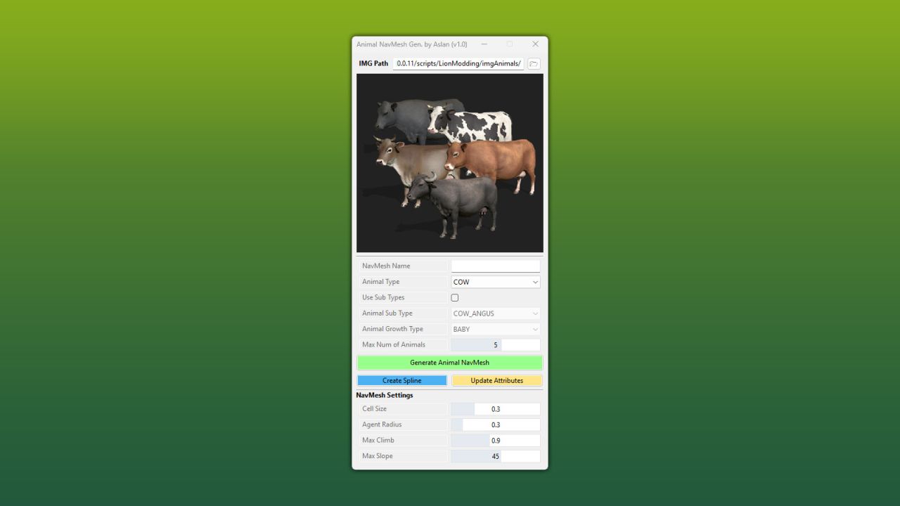 This script for the GIANTS Editor allows you to quickly and easily create navigation meshes for decorative pastures. The tool generates a NavMesh directly from a selected spline and automatically assigns the required attributes for the selected animal type.