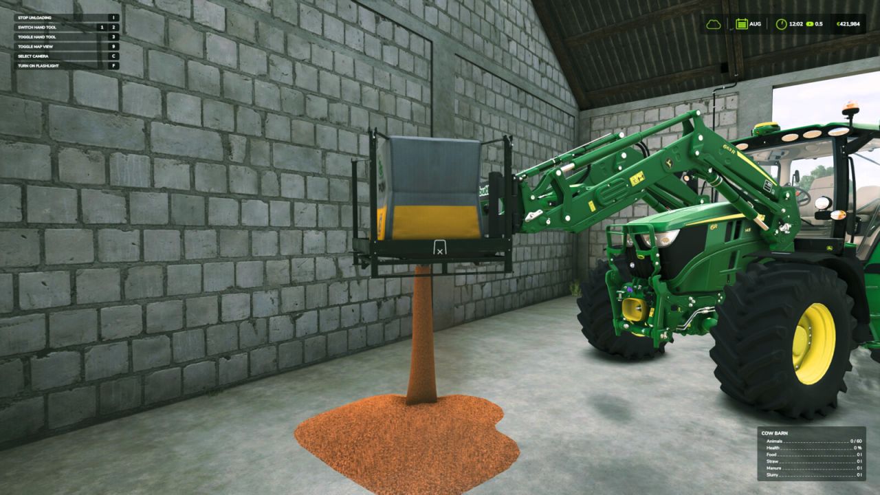 – Press ‘I’ to manually open the spout and begin unloading (you need to be on foot near the Big Bag).