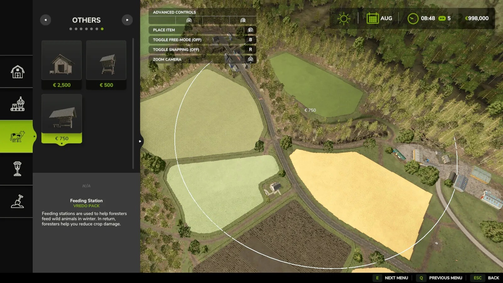 This mod adds a marker to feeding stations from the Vredo Pack DLC when placing them, allowing you to view and check the feeding station’s 250-meter action radius or effective radius before placing it permanently.