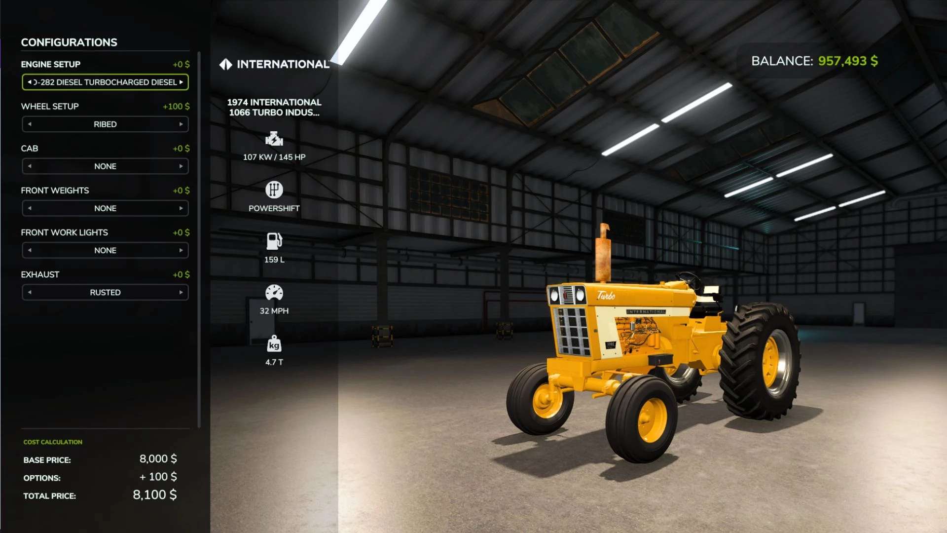 The International Harvester Farmall 1066 was made by International Harvester from 1971 to 1976. The 1066 has a six-cylinder diesel engine and about 105 drawbar and 125 PTO horsepower. Ours has been both engine power and speed (33 mph) increased for todays demanding farming tasks. The 1066 is significant for its popularity, with over 50,000 units having been built in its six-year run. There were two variations of the 1066, those being the more standard turbocharged 1066, and the Hydrostatic transmission options, We have made the Turbo variant along with the industrial version. both detailed by their respective hood decals and or color. The hydrostatic version is described to have had greatly less power than the more standard turbo variation 1066.