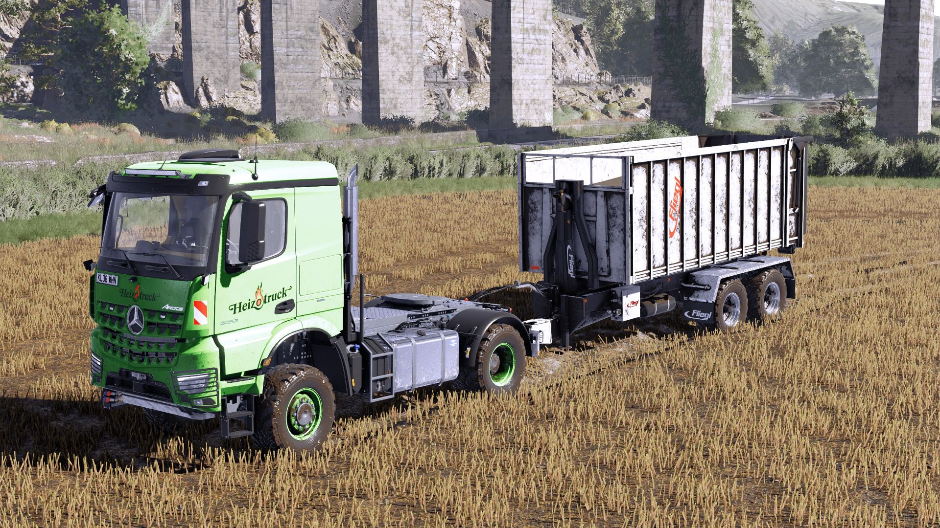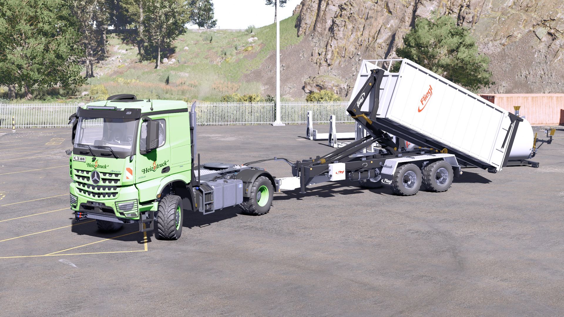 – FLIEGL HookLift trailer compatible with any container from the Mercedes-Benz DLC or any mod like ItRunner. However, if using ItRunner, it is preferable to use the 2433HD (6×4) container versions due to their size, although it is compatible with the 2633HD versions. (8×4)