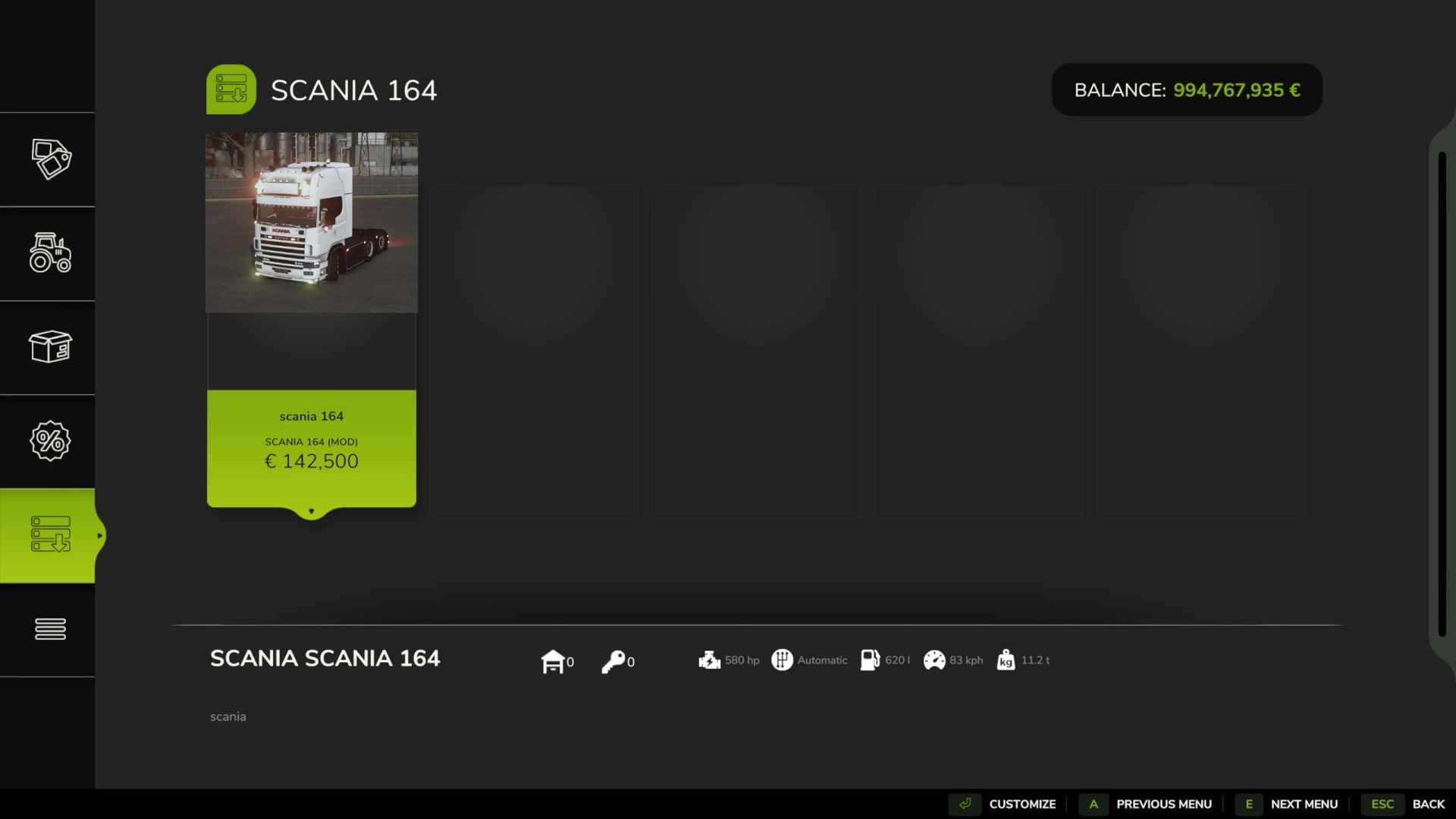 Scania 164G V8 V1.0.0.0 February 16, 2026 in Vehicles Equipped with a highly powerful V8, the Scania 164G is a 580hp work beast that’ll get any work needed done ! Price : 142.500€ Power : 580hp Top speed : 83 km/h Rate this post